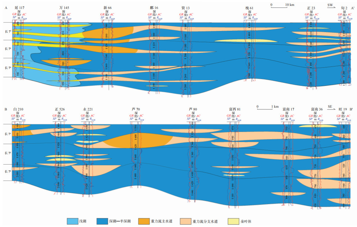 沿物源方向北东侧受北东物源影响主要发育三角洲相,中部发育半深湖—深湖及湖底扇相,湖底扇砂体延伸较远,在三角洲歼灭区发育重力流主水道,主水道砂体测井曲线呈箱形,明显厚于分支水道砂体,南西侧受南西物源影响,以重力流分支水道与朵叶体为主(图 6a);在垂直物源方向主要发育透镜状湖底扇砂体,砂体之间延伸距离较近,多呈孤立状与叠加状,长73湖底扇发育较少,以半深湖—深湖相为主,长71湖底扇发育最多,长72湖底扇发育次之(图 6b)。