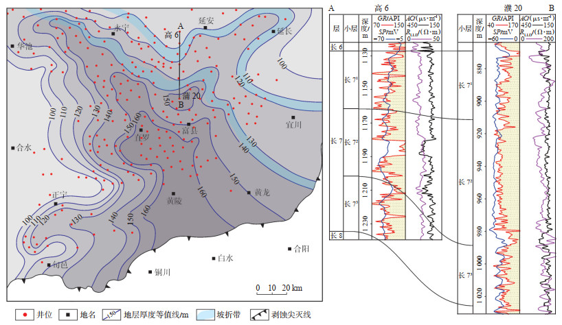 鄂尔多斯盆地东南部三叠系长7油层组地层厚度一般为100~160 m,研究区中部厚度最大,义正—直罗—黄陵地区长7油层组厚度为140~160 m,边缘区域厚度为100~110 m(图 7)。研究区存在2个地层厚度突变带,厚度等值线分别为110~120 m,130~140 m,反映出研究区长7油层组存在2个坡折带,揭示了高湖平面或低湖平面时的2个半深湖/浅湖界线。研究区西南部无明显坡折带,根据区域地质资料,合水一带是位于2个洼陷中间的低凸起,仍处于半深湖—深湖环境。
