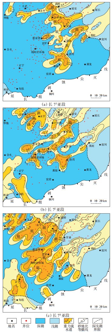 (3)长71亚段沉积相平面展布特征:长71亚段沉积期深湖范围持续缩小,三角洲向湖进积,东北方向深湖—浅湖界线南移至永宁—下寺湾—劳山—富县—洛川—黄龙一线,西南方向深湖—浅湖界线在旬邑以北一线呈北西—南东向展布,2条浅湖—深湖线所圈闭的区域为深湖亚相及湖底扇沉积(图 8c)。长71亚段沉积期与长72亚段沉积期具有一定的继承性,该时期研究区发育东北方向的4个湖底扇及西南方向的2个湖底扇。