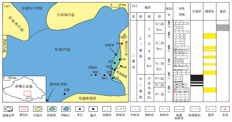 1 地质概况准噶尔盆地是我国西北地区重要的含油气盆地之一,由准南冲断带、中央坳陷、陆梁隆起、乌伦古凹陷、东部隆起与西部隆起等6个一级构造单元组成[12-13]。阜康凹陷位于准噶尔盆地中央坳陷带的东南部,是盆地六大生烃凹陷之一[14],其西至莫南凸起,东抵北三台凸起、西泉隆鼻,北至白家海凸起、东道海子凹陷,南接霍玛吐背斜和阜康断裂带[15](图 1a)。阜康凹陷先后经历了海西、燕山、喜马拉雅等多期构造运动,东部的北三台凸起经历持续抬升的过程。燕山运动是研究区二叠系后期重要的改造时期,在侏罗纪末至白垩纪初,阜康凹陷东部二叠系抬升要远大于西部凹陷深处,使研究区整体呈现“东高西低”的斜坡特征[16-18]。阜康凹陷由北向南发育阜北、阜中、阜南3个凹槽区,西泉鼻隆南北两翼分别发育阜南、阜中凹槽,南翼的阜南凹槽坡度较缓,北翼的阜中凹槽坡度较陡[19]。剖面线所在的位置自西向东依次为凹陷区、斜坡带、凸起区3个构造位置。