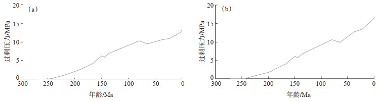 上乌尔禾组乌三段厚层泥岩是研究区良好的区域性盖层。前文分析已揭示欠压实作用是泥岩盖层中的增压方式,随着泥岩盖层持续深埋,过剩压力逐渐增大,在侏罗纪末期和白垩纪末期小幅度构造抬升作用下,过剩压力有所减小,至现今过剩压力达到最大(图 10)。