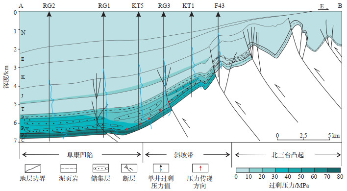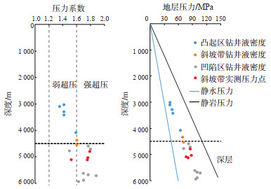 2 现今地层压力分布特征选取准噶尔盆地阜康凹陷东部钻遇目的层10口井的钻井液密度及实测地层压力资料来分析现今地层压力分布。由于研究区目的层实测地层压力资料较少,仅有阜中凹槽区F47,KT1这2口井的4个实测点,而多数井都具有钻井液密度资料,一般情况下钻井液密度对应的压力换算值略大于其对应的实测地层压力系数,一定程度上能反映地层压力的分布特征,因此本次研究借助钻井液密度的变化趋势来反映地层压力的变化特征。阜康凹陷东部地区二叠系埋深为3 000~6 000 m,地层压力系数为1.36~1.88,过剩压力为12~49 MPa,根据李伟等[21]的分类方式,研究区发育弱超压—强超压(图 2)。阜康凹陷不同构造部位二叠系超压具有较大差异,凸起区二叠系地层压力系数为1.36~1.59,过剩压力为12~23 MPa;斜坡带二叠系地层压力系数为1.52~1.79,过剩压力为24~37 MPa;凹陷区二叠系地层压力系数为1.50~1.88,过剩压力为23~ 49 MPa。由此可见,研究区凹陷区二叠系发育的超压最强,斜坡带次之,凸起区相对最弱。