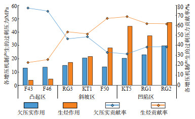 为进一步研究阜康凹陷的过剩压力分布情况,在阜康凹陷深处设置了2口人工井(图 11)。模拟结果显示,阜康凹陷不同构造部位的过剩压力分布及贡献率具有较大差异。在凸起区、斜坡带、凹陷区,芦草沟组烃源岩生烃增压量分别为3~5 MPa,17~28 MPa,37~48 MPa;生烃增压贡献率分别为22%~25%,51%~67%,61%~69%;欠压实增压量分别为12~14 MPa,13~21 MPa,20~30 MPa;欠压实增压贡献率分别为74%~77%,51%~66%,61%~69%(图 12)。综上所述,研究区芦草沟组烃源岩生烃增压贡献率由凸起区向凹陷区依次增大,而欠压实增压贡献率由凸起区至斜坡带明显降低,由斜坡带至凹陷区变化趋势不明显,说明凹陷区主要的增压作用为生烃增压(图 12)。