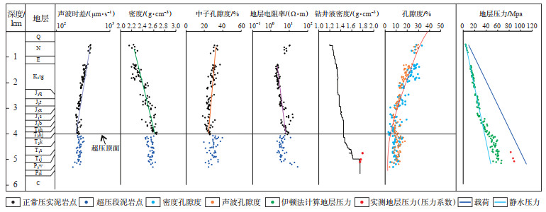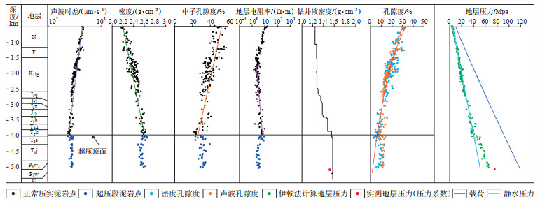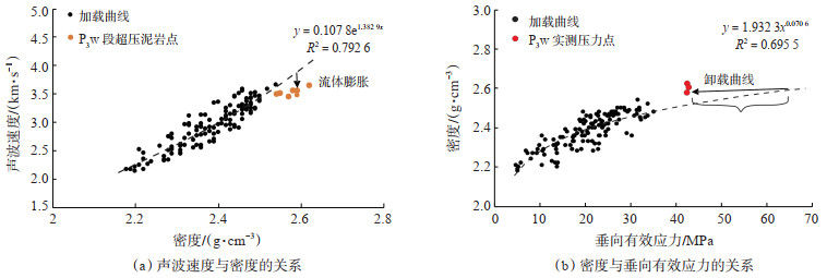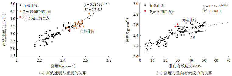 3.2 超压成因判识判识阜康凹陷东部二叠系超压成因主要依据阜中凹槽区斜坡带F47井和KT1井的实测地层压力数据。F47井泥岩综合压实曲线(图 3)显示,在深度约为4 000 m时,声波时差、密度、电阻率开始发生反转,偏离正常压实的趋势,钻井液密度由1.2 g/cm3增大到1.6 g/cm3,在深度为5 094 m处实测地层压力为76.78 MPa,压力系数为1.51,由此可判识该井克拉玛依组(T2k)底部及下伏地层内发育超压。F47井二叠系沉积厚度为480 m,泥地比为43.4%,且超压顶面下伏地层中泥岩的密度孔隙度和声波孔隙度均高于正常压实段,表现出异常高孔隙度的欠压实特征(图 3)。上乌尔禾组欠压实超压泥岩点在声波速度-密度交会图版上显示偏离了正常压实趋势线(图 4a),由此判定上乌尔禾组泥岩段超压除了欠压实作用,还有流体膨胀作用。储层实测压力段邻近泥岩点投影在密度-垂向有效应力图版上[30]处于卸载曲线的位置,垂向有效应力明显降低(图 4b),可见除了上述欠压实作用外,超压传递也是上乌尔禾组储层的一种重要超压成因。