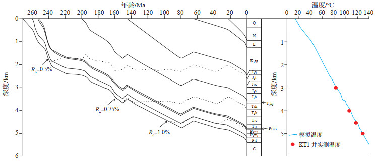 下载原图 图 7 准噶尔盆地阜康凹陷东部KT1井埋藏史、热演化史模拟 Fig. 7 Burial history, thermal history simulation of well KT1 in eastern Fukang Sag, Junggar Basin |