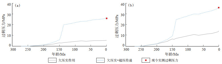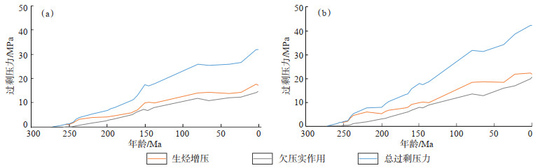 下载原图 图 9 准噶尔盆地阜康凹陷东部F47井(a)和KT1井(b)二叠系上乌尔禾组储层过剩压力演化 Fig. 9 Excess pressure evolution in reservoirs of Permian Upper Urho Formation of well F47 (a) and well KT1 (b) in eastern Fukang Sag, Junggar Basin |