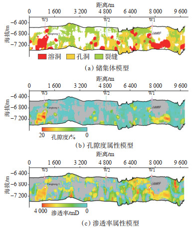 地质模型的构建基于地球物理、相控的确定性三维地质建模方法[22],针对溶洞、孔洞和裂缝3种不同介质相,优选能量梯度、杂乱、蚂蚁体等地球物理属性分别表征,由井-震标定、试井反演、动态拟合等方法确定洞穴、孔洞、断裂的雕刻门槛值后依次建立3种介质的储集体模型,最终得到融合的三维储集体模型(图 1a)。孔隙度属性模型主要基于波阻抗、测井数据,采用人机交互逐级嵌套的方法构建(图 1b);渗透率属性模型则以孔隙度分布为基础,以试井解释为约束,对3类储集体分级构建和融合(图 1c)。