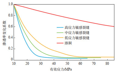 由油田开发实践与岩石力学实验表明,在开发过程中,应力敏感对断控储层有一定的影响[25]。由于缺乏顺北油田的应力敏感测试数据,根据塔河油田相关资料[26-27],设计了高、中、低3种应力敏感情况分别反映裂缝渗透率随有效应力变化的强弱(图 10),开展对比研究。