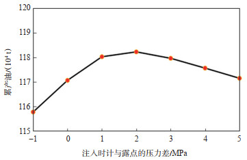 (3)过早注气会压缩油组分在衰竭阶段的采出空间,过晚注气会造成油析出损失,在露点上附近存在最优注入时机,应结合井网、井距等综合确定。