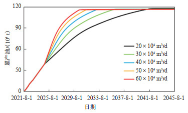 在注采平衡且总注气量一致的情况下,设计注采速度为20×104 m3/d,30×104 m3/d,40×104 m3/d,50×104 m3/d,60×104 m3/d进行模拟对比。从增油效果(图 15)看,注采速度越快,累产油就越低,这是由于注采速度越快,就越易形成气窜,致使增油效果变差;从整体看,注采速度对增油影响较小,注采速度为60×104 m3/d时的累产油比注采速度为20×104 m3/d时的累产油仅少1.1%。