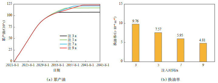 在相同的注气速度下,模拟3 a,5 a,7 a,9 a等不同注入时间下的增油效果。模拟结果(图 16a)显示,注入时间越长,注入量越大,累产油就越高,但增长幅度变缓,注入5 a方案与注入3 a相比增油8.7%,而注入9 a方案仅比注入7 a相比增油1.5%。不同注入时间方案的换油率统计结果(图 16b)显示,换油率随注入时间的增加而减小,即随着注气进行,每万方注入气增加的产油收益不断减少,表明最优注入时间(注入量)与储量规模有关,具体还要结合经济效益综合考虑。
