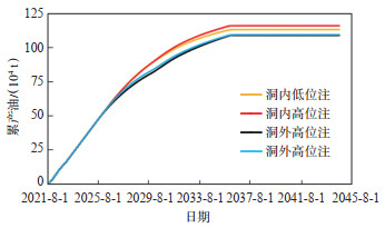 当气井部署于溶洞低部位时(图 18),不同注入部位方案模拟结果(图 19)显示,高位注比低位注增油效果更好,与传统部署井网的认知相符,由于注入干气与气藏湿气的重力分异作用,采用“高注低采”的方式更利于气顶驱的形成;洞内注的方案优于洞外注的方案,这是由于注入干气的强流动性和强驱替能力,洞外注易将油组分沿裂缝等高渗通道驱至远井带,停注后随压力降低析出、沉降而无法采出,而洞内注则更易使注入气作用于洞内的主要储量,将主要储量定向驱出。