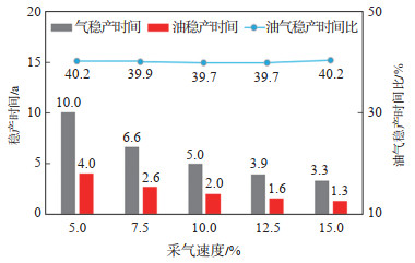 下载原图 图 5 衰竭式开发不同采气速度下的稳产时间对比 Fig. 5 Stable production time of oil and gas at different gas recovery rates under natural depletion