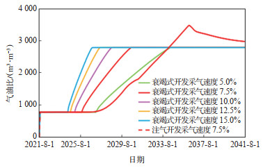 下载原图 图 6 不同采气速度下气油比曲线 Fig. 6 Gas-oil ratio curves at different gas recovery rates