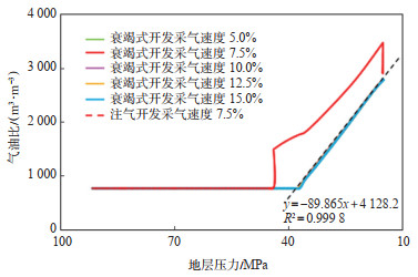对比衰竭式开发不同采气速度下的气油比模拟曲线(图 6)可知,当地层压力到达露点前,气油比保持原始不变;露点后气油比快速上升,不同采气速度下的气油比均由765 m3/m3上升至2 777 m3/m3,衰竭式采气速度越大,气油比上升幅度就越大。反凝析后气油比变化主要受压力的影响,压力每降单位兆帕,气油比约升高90 m3/m3图 7);与衰竭式开发对比,注气开发能使油稳产时间变长,气油比上升的时间点更晚,上升的最大值也更大,停止注气后曲线呈先快速上升后缓慢下降。