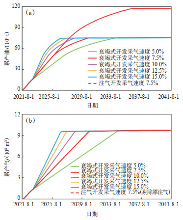 下载原图 图 8 不同采气速度下累产油(a)、累产气(b)与时间关系曲线 Fig. 8 Relationships of time with cumulative oil (a) and gas (b) production at different gas recovery rates