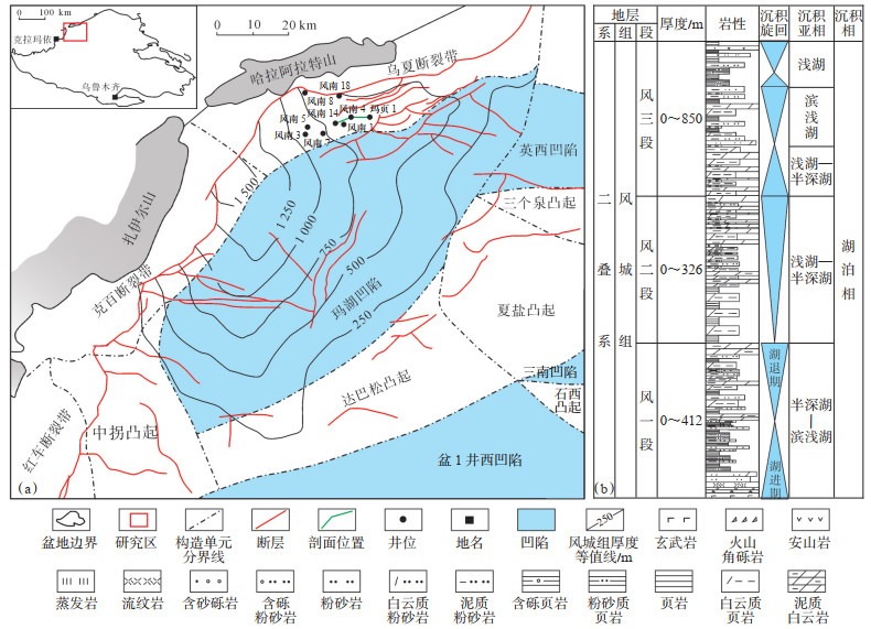 玛湖凹陷是准噶尔盆地六大生烃凹陷之一,也是最富有机质的生烃凹陷[16, 20],其发育石炭系和二叠系佳木河组、风城组、下乌尔禾组4套烃源岩,其中风城组为主力烃源岩,厚度为50~400 m,分布面积为3 800 km2[16, 22, 29]。风城组自下而上分为风一段、风二段和风三段,不同层段沉积水体的盐度及沉积岩石类型有差异(图 1b)。风一段岩性以凝灰岩、凝灰质白云岩、火山岩为主,处于淡水及低盐度半深湖—滨浅湖环境;风二段以泥质白云岩和混积岩为主,为咸化浅湖—半深湖环境;风三段以凝灰岩、泥质白云岩和泥岩为主,为弱咸化滨浅湖—半深湖环境[15, 22, 30]。