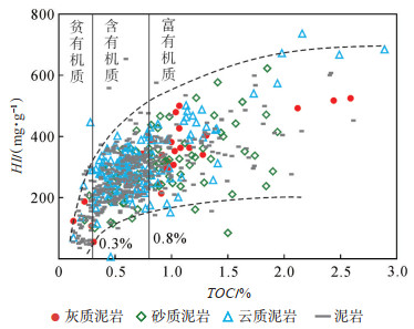 3.1.1TOC值与氢指数具有较好的正相关性[45],随着TOC值的增大,氢指数增大,反映有机质的类型逐渐变好。根据风城组烃源岩611块样品TOC值与HI值关系(图 11),随着TOC值增大,HI值的增大呈阶段性变化,表现出先快速增大、后缓慢,最后趋于稳定的特征,其对应的TOC界限分别为0.3% 和0.8%。据此特征,将风城组泥岩分为富有机质泥岩(TOC>0.8%)、含有机质泥岩(0.3% ≤ TOC ≤ 0.8%)和贫有机质泥岩(TOC<0.3%)3类(图 11),相对应的有机质类型从Ⅰ—Ⅱ型、Ⅱ型逐渐过渡到Ⅲ型。