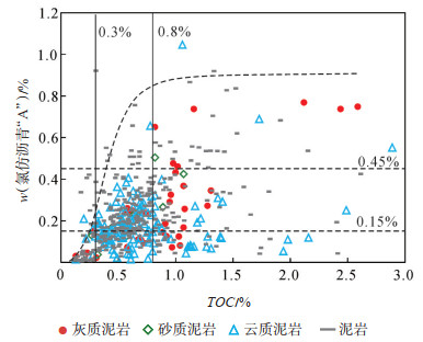 下载原图 图 12 玛湖凹陷二叠系风城组氯仿沥青“A”与TOC关系 Fig. 12 Relationship between chloroform bitumen "A" and TOC of Permian Fengcheng Formation in Mahu Sag |