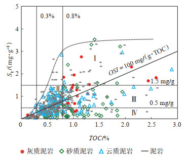 TOC与S1散点关系(460块样品)也表现为“三段式”(图 13),当TOC值较高时,S1为相对稳定高值;当TOC值较低时,S1保持低值;而TOC介于高、低值之间时,S1表现出快速上升特征。卢双舫等[41]在TOC与S1关系图中将外包络线与相应低TOC分界线交点(界限1)定为无效与低效资源的分界线;低效与富集资源的S1界限(界限2)为外包络线稳定段S1与界限1对应的S1的平均值。根据上述方法确定了风城组S1的分级界限标准,S1小于0.5 mg/g为分散资源,S1大于1.5 mg/g为富集资源,介于二者之间的为中等富集、低效资源(图 13)。富有机质页岩中虽然含油量高,但真正对页岩油产量起主要贡献的仍以游离烃(可动烃)为主,为了去除有机质对页岩油吸附量的影响,Jarvie[46]提出用油饱指数(OSI =S1/TOC)来评价页岩油的勘探潜力,当OSI大于100 mg/(g·TOC)时,产生油超越效应,页岩油勘探潜力好。该界限值在国内外页岩油评价中得到广泛应用,并已经被勘探实践所证实。根据OSI界限值100 mg/(g·TOC)和S1分级界限标准值,将风城组页岩油划分为4种资源类型(图 13)。