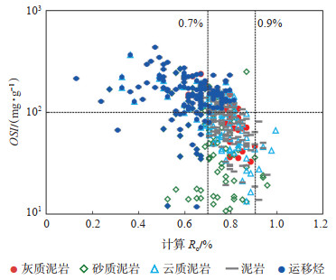 成熟度是影响页岩油生成产物类型、生烃量及流体性质的重要因素。玛湖凹陷风城组计算Ro依据Jarvie等[47]提出的经验公式(Ro =0.018×Tmax-7.16),其主要适用于Ⅱ型干酪根成熟度评价。研究发现,由于风城组烃源岩(460块样品)位于生油窗阶段,Ro范围较为集中,因此不同富集程度的页岩油其Ro的差别较小(图 14),相对而言,风城组富集资源的Ro为0.7%~0.9%。需要注意的是,受样品保存条件与时间、实验过程等因素的影响[46],常规S1与原地滞留烃含量相比,由于轻烃的大量散失,其反映的含油性被严重低估,而成熟度是影响S1轻烃散失量的重要因素。随着计算Ro的增加,OSI整体具有减小的趋势(图 14),当Ro为0.7%~0.9% 时,OSI大于100 mg/(g·TOC),Ⅰ类(运移烃+滞留烃)页岩油富集;当Ro小于0.7% 时,以运移烃为主,Ⅱ类页岩油富集。