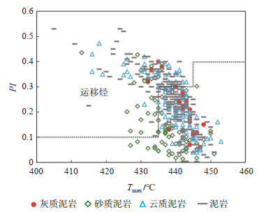 风城组烃源岩产率指数(PI)与Tmax(424块样品)表现出显著的负相关性(图 15),再一次证明由于运移烃的贡献使风城组页岩在未熟阶段存在大量的滞留烃。Tmax小于435 ℃时,干酪根尚未成熟,不会生成大量的石油,其高PI代表了近源运聚的石油[48]。Tmax为435~445 ℃时为大量生油阶段的早期,页岩中少部分为运移油,主体以“自生自储”为主。Tmax大于445 ℃为生油高峰阶段,由于此阶段石油大量生成并排出,所以PI较小,且随着Tmax升高而持续减小(图 15)。