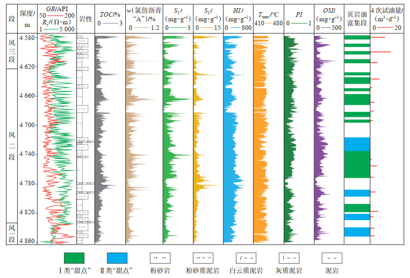 风城组不同岩性的泥岩中均存在运移油的特征(高PI、高OSI、低Tmax)。贫有机质及含有机质的层段,运移烃含量高,页岩油可动性好。风城组烃源岩纵向上发育多个有机质富集段,与贫有机质段间互分布。富有机质段残留烃含量高,页岩油富集;贫有机质段有较多的运移油贡献时,OSI高,原油可动性好。玛湖凹陷玛页1井风城组纵向上岩性复杂且变化快[8, 30],发育各种与沉积或成岩作用有关的复杂构造现象。页岩油选段评价时,首选有机质富集、S1和氯仿沥青“A”含量高且OSI值大于100 mg/g的层段,其次为贫有机质但S1较高(0.5~1.5 mg/g)的层段。玛页1井风城组“甜点”预测揭示Ⅰ类页岩油主要分布在风三段和风二段的中上部,Ⅱ类页岩油主要分布在风二段中下部和风一段上部(图 16)。预测“甜点”段与单层试油产量具有较好的对应关系,Ⅰ类页岩油段单层试油可获得较高产量,但也存在一些层段试油产量低,说明其他因素控制着页岩油的富集;Ⅱ类页岩油段试油产量相对较低(图 16)。