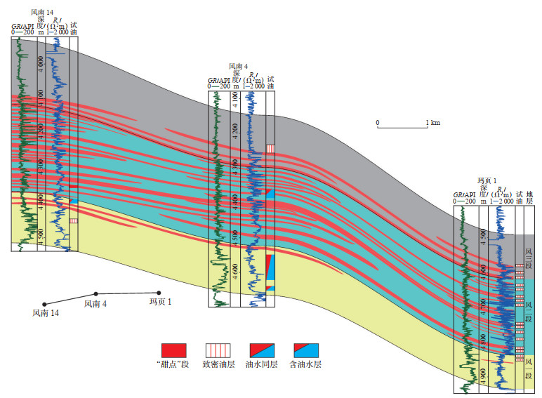 从油藏及“甜点”分布剖面特征(图 17)来看,风城组页岩油“甜点”主要分布于风二段,其次为风三段,具有源-储一体的特点。由于“甜点”段过于分散,导致的单层试油产量总体偏低;但“甜点”段累积厚度大,采用大段分层压裂可获得高产工业油流,玛页1井风二段和风三段试油后平均日产22.5 m3[22],显示出良好的页岩油勘探前景。风一段发育火山岩、碎屑岩和白云岩,气孔和粒间孔为主要的储集空间,孔隙度为6%~12%[51],形成“上生下储”型组合,成藏条件好,是高产工业油流的主要勘探目标。