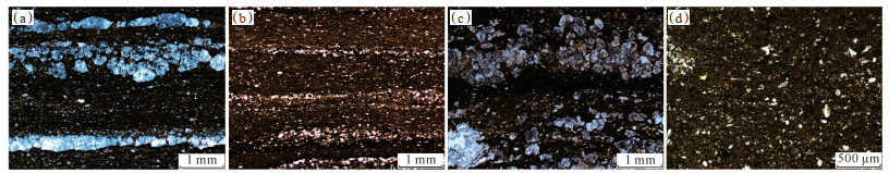 2 岩石学及地球化学特征 2.1 岩石学特征根据玛页1井风城组15块泥质岩全岩X射线衍射和岩石薄片鉴定结果可知,风城组泥质岩的主要矿物组成包括石英(平均质量分数为24.6%)、长石(平均质量分数为23.5%)和白云石(平均质量分数为25.4%);其次为方解石(平均质量分数为12.5%)和黏土矿物(平均质量分数为10.5%);少量的黄铁矿(平均质量分数为3.6%)。除泥岩外,风城组其他3种岩性的矿物组成在显微镜下大多顺层面分布(图 2a—2c),而泥岩中脆性矿物多呈星点状的杂乱分布(图 2d)。据此将风城组岩性划分为灰质泥岩、砂质泥岩、云质泥岩和泥岩4种类型。