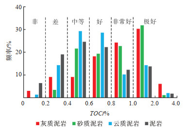 2.2.1 TOC对玛湖凹陷风城组611块岩样(泥岩342块、云质泥岩147块、砂质泥岩88块、灰质泥岩34块)的分析表明,TOC为0.11%~3.19%,平均为0.75%。岩性不同TOC值有较大差异,4种岩石类型中,灰质泥岩和砂质泥岩TOC的平均值相对最高(均为0.95%),云质泥岩次之(0.73%),泥岩最小(0.69%)。TOC大于0.60% 的好烃源岩占比56.39%,泥岩和云质泥岩TOC分布频率一致,灰质泥岩和砂质泥岩TOC分布频率相似(图 3)。