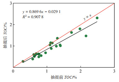 下载原图 图 4 玛湖凹陷风南14井二叠系风城组白云质泥岩抽提前、后TOC对比 Fig. 4 Comparison of TOC before and after extraction of dolomitic mudstone of Permian Fengcheng Formation of well Fengnan 14 in Mahu Sag |
