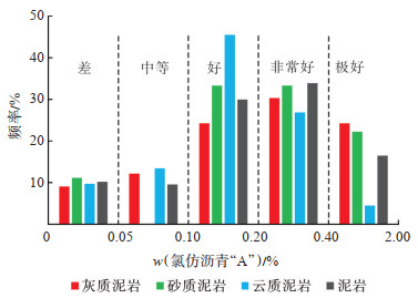 玛湖凹陷风城组480块(泥岩304块、云质泥岩134块、砂质泥岩9块、灰质泥岩33块)氯仿沥青“A”测试结果显示:不同岩性其分布总体形态特征近似,主频均为0.1%~0.4%,主体达到好烃源岩标准以上,好—极好烃源岩占比高达80.6%(图 5)。相比较而言,云质泥岩和泥岩特征更为接近,但泥岩氯仿沥青“A”平均含量高于云质泥岩;灰质泥岩和砂质泥岩氯仿沥青“A”分布特征接近,两者氯仿沥青“A”大于0.4% 的占比高于泥岩和云质泥岩,揭示出此2种岩性的页岩含油性好,页岩油富集程度高。