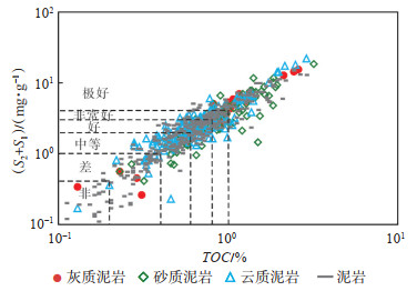 对玛湖凹陷风城组611块岩样分析可知,生烃潜量(S1+S2)为0.11~21.97 mg/g,平均为3.11 mg/g。若参考陆相烃源岩评价标准,将S1+S2大于6 mg/g作为好烃源岩的下限[31],则风城组有10.63% 的样品达到好烃源岩以上级别,与氯仿沥青“A”和TOC反映的风城组主体以好烃源岩为主相矛盾,这可能与风城组烃源岩具有高的烃类转化率有关[20]。TOC与生烃潜量具有较好的正相关性,根据陆相咸水湖盆烃源岩TOC评价标准[31],以此确定生烃潜量达到2 mg/g即为好烃源岩标准(图 6),其在风城组占比可达60.12%,这与TOC和氯仿沥青“A”的评价结果大体一致。