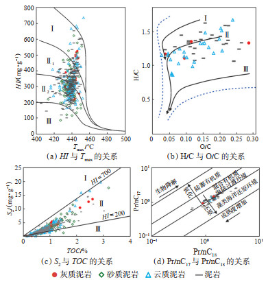 多种方法均可以有效判别陆相烃源岩有机质的类型[24]。由氢指数与最高热解峰温(Tmax)关系(611块样品)(图 7a)可知,4种岩性的对应数据大部分分布在Ⅱ型干酪根区域,且以更倾油的Ⅱ1型干酪根为主,同时还存在部分Ⅰ型和少量Ⅲ型干酪根。干酪根元素组成(41块样品)(图 7b)显示,不同岩性的烃源岩主要沿Ⅱ型干酪根演化轨迹变化。在TOC与热解烃量(S2)的关系(219块样品)(图 7c)中,不同岩性的烃源岩均主要分布在Ⅱ型干酪根区域,且随着TOC增加,有机质类型偏向Ⅰ型干酪根。从59块烃源岩样品母质来源及形成环境(图 7d)来看,风城组烃源岩有机质主要源自陆源输入及水生生物的共同贡献,表现为混合型有机质,不同岩性的烃源岩形成环境差别不大。
