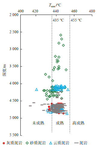为了消除质量差数据和不同有机质混合对解释结论的影响,参考以往研究成果[34, 37],研究中将S2值大于0.5 mg/g且TOC大于0.6%(好烃源岩级别)的数据作为有效数据,从总数611块样品中剔除了266块Tmax值不可靠样品。由风城组深度与Tmax的关系(图 8)可知,85% 的样品Tmax为435~455 ℃,主体处于生油高峰成熟演化阶段。