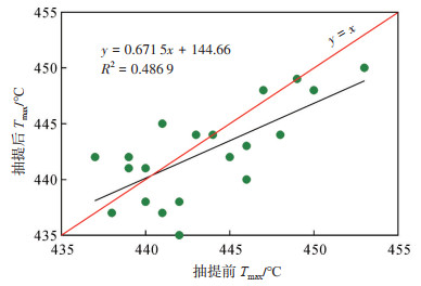 下载原图 图 9 玛湖凹陷风南14井二叠系风城组白云质泥岩抽提前、抽提后Tmax对比 Fig. 9 Comparison of Tmax before and after extraction of dolomitic mudstone of Permian Fengcheng Formationof well Fengnan 14 in Mahu Sag |