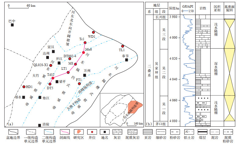 研究区位于四川盆地东北部,东与云阳县,南与石柱土家族自治县和湖北利川市接壤,西与忠县和梁平区邻近,北与开州区和四川省达州市开江县相邻,地势东高西低,地质构造发育,向斜与背斜交错相接,整体形态呈现出高背斜、宽向斜的隔挡式构造[22]。研究区隶属于川东高陡褶皱带,受开江—梁平海槽控制,广泛发育上二叠统吴家坪组海相页岩(与龙潭组为等时异相沉积)[23]。吴家坪组自下而上分为吴一段、吴二段和吴三段,吴一段岩性复杂,主要为细砂岩、泥岩、灰岩及煤层;吴二段发育厚层富有机质页岩,夹有灰岩,为本文主要研究层段;吴三段以厚层灰岩、泥质灰岩为主,顶部见页岩沉积(图 1b)。
