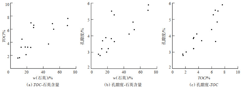(2)成岩改造作用下石英的抗压保孔作用和有机质生烃作用是页岩储层形成的关键。研究区吴二段深水陆棚相页岩的石英呈微晶状,且常与有机质相伴生,指示其具有较高的古生产力,石英含量与TOC含量呈正相关关系,石英含量越高,TOC含量也越高(图 10a),因此可以认为高古生产力是有机质富集的关键因素。吴家坪组埋深可达6 000 m以上[14],在强压实作用下,塑性矿物如黏土等在成岩阶段的机械压实过程中变得更加紧实,而刚性矿物如生物石英具有较强的抗压能力,可为有机质孔和其他孔隙的保存提供保护作用。研究区吴二段石英含量与孔隙度呈正相关关系(图 10b),表明生物成因石英在成岩过程中具有抗压保孔的重要作用,是页岩储集空间得以保持的关键,其含量越高,储层孔隙度越大。TOC含量与孔隙度也呈正相关关系随着TOC含量的增加,孔隙度呈上升趋势(图 10c),说明有机质的热成熟作用是有机质孔隙大量形成的催动力,促使有机质孔隙大量发育,同时在生烃过程中,液态烃裂解生气,具备较强的生气能力。