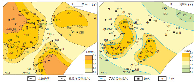 利用研究区63口井吴二段测井解释结果绘制孔隙度及TOC含量平面分布图(图 11),可看出:①孔隙度由北至南整体呈现高—低—高—低的特征,在达州和忠县一带最高,超过4.00%,高值区与深水陆棚相发育区基本一致,深水陆棚相页岩储层的物性较好。②深水陆棚相对于TOC含量具有明显控制作用,TOC含量高值区集中于深水陆棚相内,万州和开江—达州一带TOC含量最高,一般大于2.00%,高值可达4.00% 以上,而其他沉积相页岩TOC值一般低于2.00%。