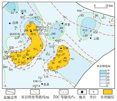 在深水陆棚沉积相平面分布的约束下,优选TOC值大于4.00%、孔隙度大于3.00% 的区域,通过叠合法预测开江—梁平地区及万州地区为研究区吴二段页岩储层发育的有利区(图 12)。