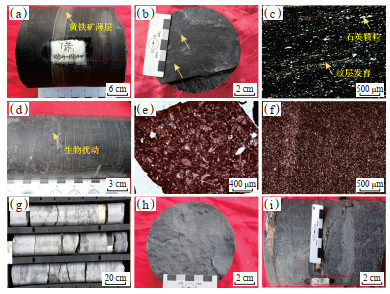 研究区陆棚相可分为浅水陆棚相和深水陆棚相2种亚相,其中深水陆棚相以细粒沉积物为主,岩性主要为页岩、硅质页岩及硅质岩(图 2a—2c),间有薄层灰岩发育;测井响应特征表现为自然伽马(GR)值为70~150 API,曲线异常幅度高,表现为微齿状,齿状及光滑均少见,形态呈箱形,而电阻率值相对较低,一般低于20 Ω·m。浅水陆棚相岩性以灰岩和页岩为主(图 2d,2e),发育少量泥灰岩或灰质泥岩,GR值为20~50 API,曲线异常幅度低,呈齿状或微齿状,形态呈钟形、指形或钟形-指形的复合叠加形,顶、底面多为突变接触,电阻率值相对较高,一般大于400 Ω·m,曲线形态呈钟形或圣诞树形。