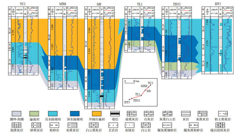 下载原图 图 3 川东北地区过TC1—MX6—M8—TL1—TD32—DT5井二叠系吴家坪组沉积相连井剖面 Fig. 3 Well-tie profile of sedimentary facies of Permian Wujiaping Formation across wells TC1, MX6, M8, TL1, TD32 and DT5 in northeastern Sichuan Basin |