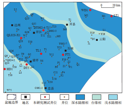 以往研究表明,晚二叠世吴家坪组沉积期四川盆地从南西—北东方向依次发育河流相、滨岸沼泽相、潮坪-潟湖相、浅水陆棚相和深水陆棚相[25],受晚二叠世东吴运动的影响,盆地呈现出“北东低、南西高”的构造格局,而研究区正好位于海水退去方向。通过对研究区老井进行摸排与复查,发现吴二段沉积时期在开县—云阳地区、梁平西南部发育浅水陆棚相,而深水陆棚相分布范围更大,主要在达州—开江—万州—忠县一带沿北西—南东方向呈连通条带状展布(图 4)。综合分析认为,沉积相差异性分布一方面是因为海平面呈现上升趋势,导致深水范围变大;另一方面受峨眉山地裂运动影响(吴家坪组底部可见玄武岩和凝灰岩),中二叠世茅口组沉积晚期研究区开始裂陷,吴家坪组沉积时呈现继承性[26-27]。随着研究区深水陆棚沉积相的扩大,页岩厚度也变大,深水陆棚区FT1井吴二段页岩厚度达到23.0 m,而浅水陆棚区域的T30井吴二段页岩厚度仅3.5 m。