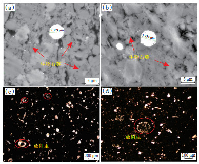 研究区吴二段页岩岩心样品扫描电镜观察结果显示:①石英具有微晶特征,呈絮凝状,与长宁地区志留系龙马溪组底部页岩具有相似性,均具有生物石英的特征(图 5a,5b);广泛发育分散状的黑色有机质,生物石英与有机质相伴生。②黄铁矿类型多样,有草莓状黄铁矿和自形黄铁矿,其中草莓状黄铁矿的粒径可以反映页岩的水体环境,如FT1井页岩样品中草莓状黄铁矿的粒径约为5.3 μm,与龙马溪组底部页岩中的草莓状黄铁矿具有相似的小粒径(< 6.0 μm)特征,指示吴二段页岩沉积时水体为还原环境。③样品中有放射虫发育,与龙马溪组底部页岩发育的放射虫相似(图 5c,5d)。整体而言,吴二段深水陆棚相页岩中发育的石英、黄铁矿、放射虫等均与龙马溪组底部页岩具有相似的特征。因此,根据学界对龙马溪组多年的研究成果可以推测,吴二段深水陆棚相页岩具有较高的生产力,沉积时为还原环境,有利于有机质的富集,具有较大的勘探潜力。