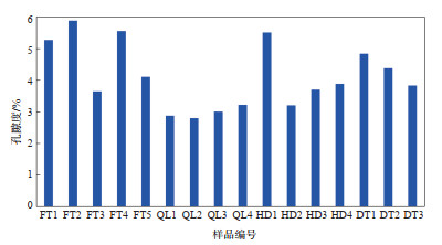 对研究区吴二段16块页岩样品的孔隙度测试结果显示,孔隙度为2.80%~5.89%,平均值为4.11%,储集物性整体较好(图 6)。