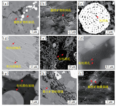 粒间孔隙主要发育于脆性矿物颗粒之间(图 7a,7b);粒内孔隙主要包括方解石、白云石等矿物的溶蚀孔以及草莓状黄铁矿晶间粒内孔,通常呈椭圆状或不规则棱角状,孔径为数十到数百纳米(图 7c,7d)。有机质孔以圆形、椭圆形或不规则状为主(图 7e,7f),孔径为几到几百纳米,其中镜质组并不发育孔隙,其内部与边缘多发育一些微裂隙(图 7g);固体沥青内部很少发育孔隙,或发育少量彼此独立且较大的孔隙(图 7e);腐泥组的孔隙发育程度受热演化程度影响,多呈现不规则状,数量众多,但尺度较小,孔径一般小于100 nm,连通性较好(图 7f)。此外,吴家坪组页岩有机质类型以Ⅱ型为主,该类有机质主要与其周围的胶结物相关,孔隙粒径较大,可以容纳相当数量的流体[30]。微裂缝主要为有机质收缩缝、黏土矿物收缩缝以及脆性矿物中受外力作用影响所形成的粒内微裂缝(图 7g—7i)。