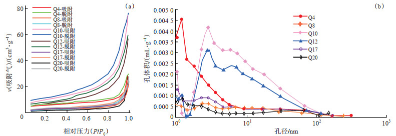 氮气吸附法及高压压汞法可表征页岩不同孔径的特征[31-32],依据IUPAC对回滞环等温吸附曲线的分类[33],万州地区吴二段页岩样品的氮气吸附脱附等温曲线显示其回滞环类型为H3型,指示其孔隙形态为半封闭孔,孔隙形状主要为楔形状的狭缝孔,以中孔为主,发育少量的微孔(孔径 < 2 nm)和宏孔(孔径 > 50 nm)(图 8a)。高压压汞实验结果显示,个别样品在微孔尺度范围内孔体积随着孔径的增大,但整体上样品表现出随着孔径增大而增大,孔体积减小的规律,同时中孔(孔径为2~50 nm)对孔体积的贡献率最大(图 8b)。