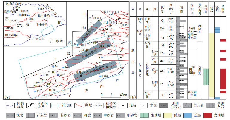 下载原图 图 1 东营凹陷八面河地区构造位置(a)及八面河地区岩性地层综合柱状图(b) Fig. 1 Structural location (a) and stratigraphic column (b) in Bamianhe area, Dongying Sag |