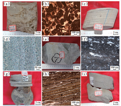 下载原图 图 2 东营凹陷八面河地区沙四段4砂组薄片及岩心特征 (a)块状颗粒云岩,风暴搅动变形,溶孔发育,M14-8-X71井,1 231.7 m;(b)球粒、内碎屑,M120-12-X19井,1 142.7 m;(c)微晶云岩,极薄纹层状,M22-5-X13井,1 197.8 m;(d)微晶云岩,晶粒直径15~25 μm,M22-6-X151井,1 181.9 m;(e)致密块状泥晶云岩,M22-5-X13井,1 183.3 m;(f)泥晶云岩,含少量亮晶胶结物,含油性差,M22-12-X15井,1 253.6 m;(g)页岩,页理现象发育,M14-12-X27井,1 234.9 m;(h)页岩,含有少量油珠,M120-25-X10C井,1 405.5 m;(i)粗砂岩,顶底均为云岩,M22-5-X13井,1 185.0 m。 Fig. 2 Characteristics of thin section and core in the fourth sand formation of Sha 4 Formation in Bamianhe Area, Dongying Sag |