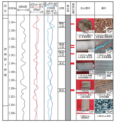 1 地质概况研究区位于东营凹陷南部的八面河地区,面积共1 139 km2,地理位置处于山东省寿光市及其周缘地区,构造位置处于东营凹陷南坡八面河鼻状构造带上。八面河地区北部与王家岗油田毗邻,南部与广饶凸起相接,该地区的构造单元自北向南可划分为北部斜坡带、鼻状构造带和南部斜坡带3个次级构造单元(图 1a)。自中生代以来,八面河地区构造活动频繁,燕山运动Ⅳ幕使该地区构造抬升遭受剥蚀,随后盆地沉降并接受沉积。沙四段沉积早期,构造活动相对稳定,沙四段沉积末期,基底抬升,湖盆面积减小,致使沙三下亚段沉积间断,沙三中亚段与沙四段地层形成不整合接触,长期的构造活动促进了古斜坡的发育,早期的构造运动奠定了南高北低的古构造形态,塑造了南高北低的沉积格局。沉积地层在南西—北东向呈小幅加厚的趋势[25]。此外,该区发育北东向、东西向断层[26],断层数量众多但活动性弱。八面河地区古近系地层自下而上依次发育孔店组(Ek)、沙河街组(Es)(图 1b)。其中,沙河街组自下而上可分为沙四段(Es4)、沙三段(Es3)、沙二段(Es2)和沙一段(Es1)。沙四段进一步划分为沙四上亚段(Es4上)和沙四下亚段(Es4下),沙四上亚段包含1~4砂组,其中4砂组为本次研究目的层。沙四段是主要的生油层和储集层,为勘探开发的重点层系。八面河地区沙四段以湖泊相为主,受东亚季风气候影响[27],整体呈现干热气候特征,湖水蒸发量大,形成了半咸水—咸水湖泊环境。在4砂组沉积时期形成大量白云岩,随着气候周期性变化,沉积环境发生变化,3砂组沉积时期沉积物类型由碳酸盐岩转为碎屑岩。